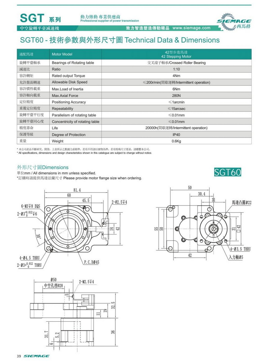 西馬格中空旋轉(zhuǎn)平臺SGT60,可配各品牌伺服電機(jī),50/100W伺服馬達(dá),各廠家42型步進(jìn)馬達(dá),步進(jìn)電機(jī)。減速比有1:5,1:10,1:18等。